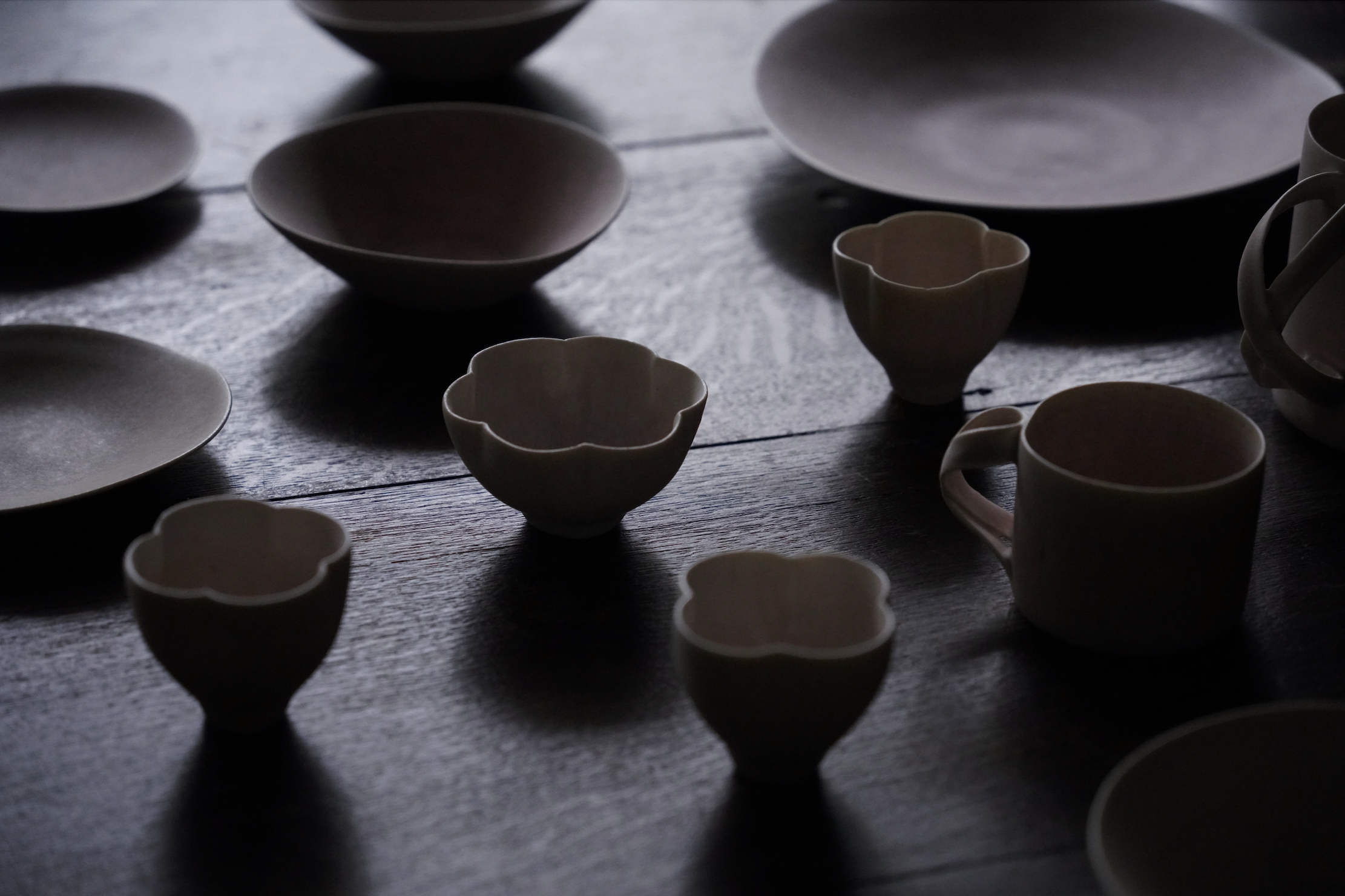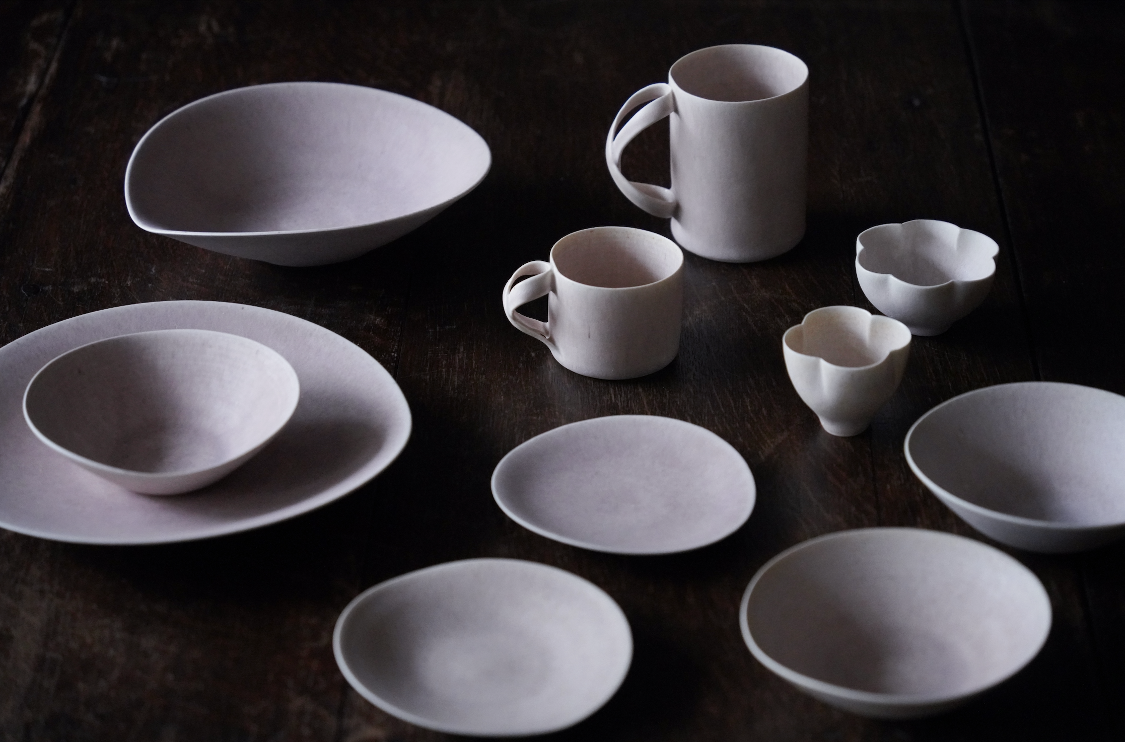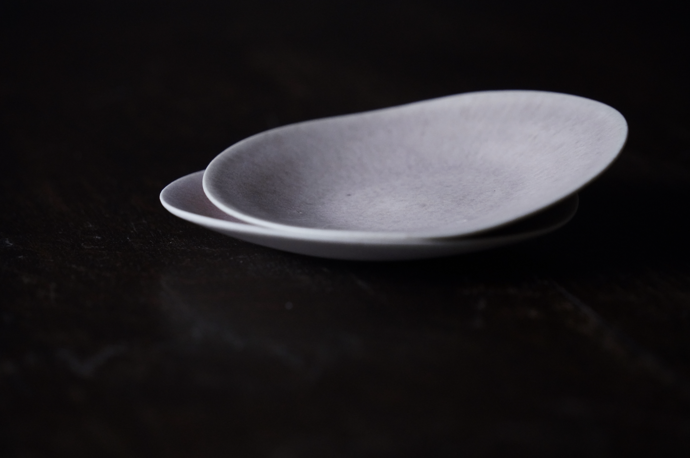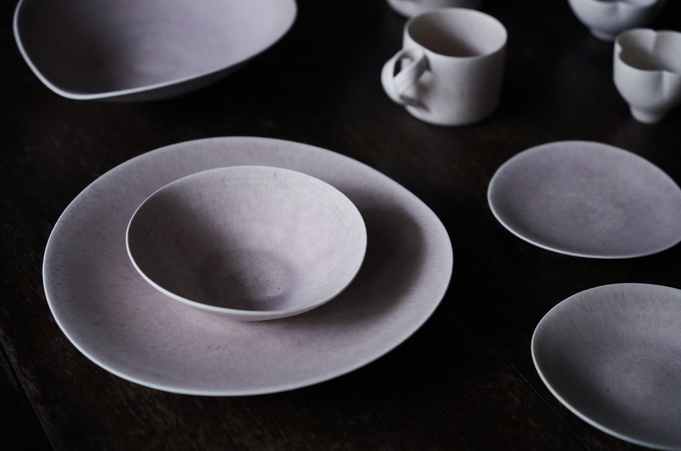 藍、白、藕粉,時常出現在魂生製器的作品中。這些色彩源自她日常中每日的光——海霧將藍分層、白雲留下呼吸的停頓、藕粉是黎明的一道暖意。「這些顏色不是配色表上的選項,而是與之共存的我,日常裡的時間感。」張靚妤創作從光的濃淡與色溫開始,經由速寫與試片,轉化為釉層厚薄與弧線走向。外觀講求簡潔優雅,薄壁輕手,讓器物能在反覆使用與清洗中長久陪伴。