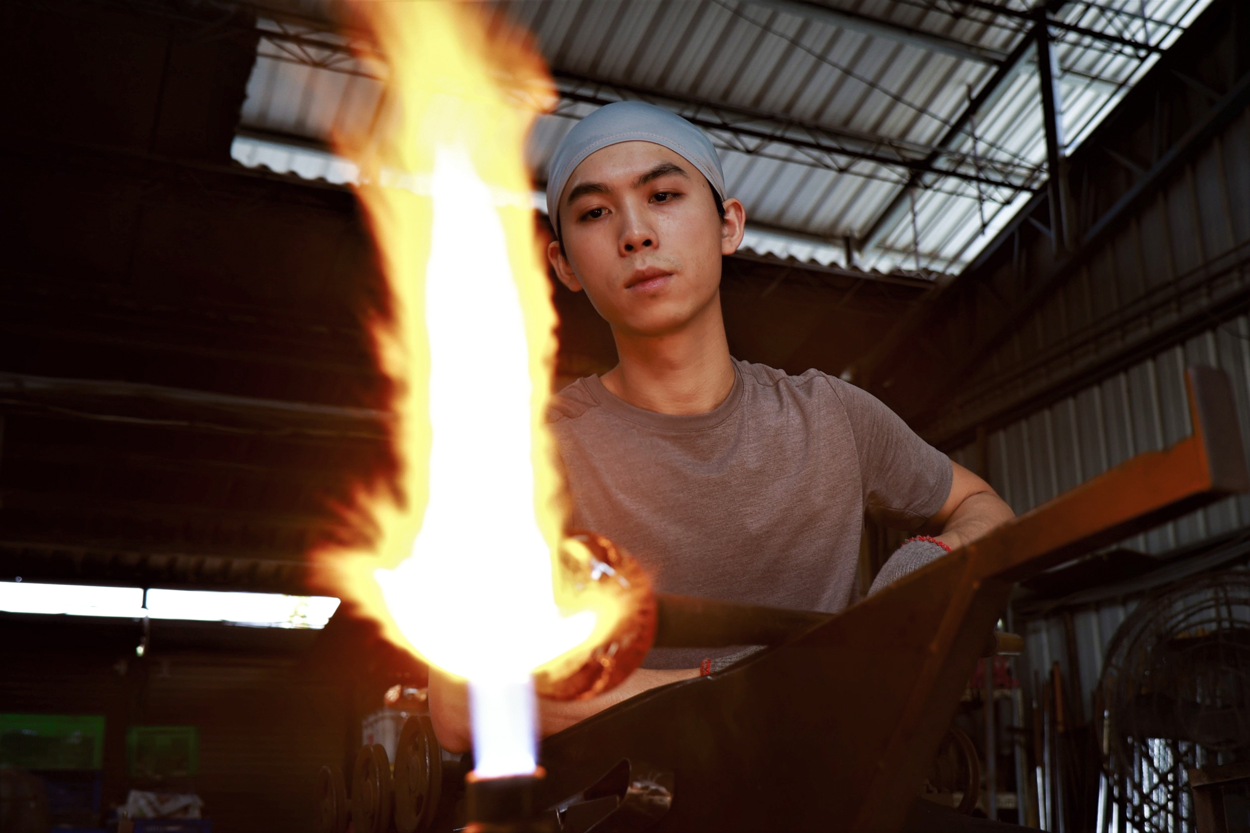 展覽的第一個系列,以玻璃窯爐的日常場景為靈感,捕捉工藝師直面高溫火焰的創作視角。窯爐的紅光與熱浪,猶如一顆小太陽,對視力與體能都是極大的挑戰。然而,這些困難正是創作生命力的源泉。陳建志在作品中真實再現了這份對抗高溫的專注與張力,讓觀者得以一窺藝術誕生的瞬間,也感受工藝背後的熱忱與堅韌。;第二個系列則將窯爐高溫的意象轉化為生活物件,以永不褪色的玻璃象徵窯爐永不熄滅的火焰。作品設計充滿創意與跳脫框架的視角,既是對工藝本身的致敬,也將藝術融入生活,讓觀者得以在日常使用中體驗到玻璃的溫潤與力量。