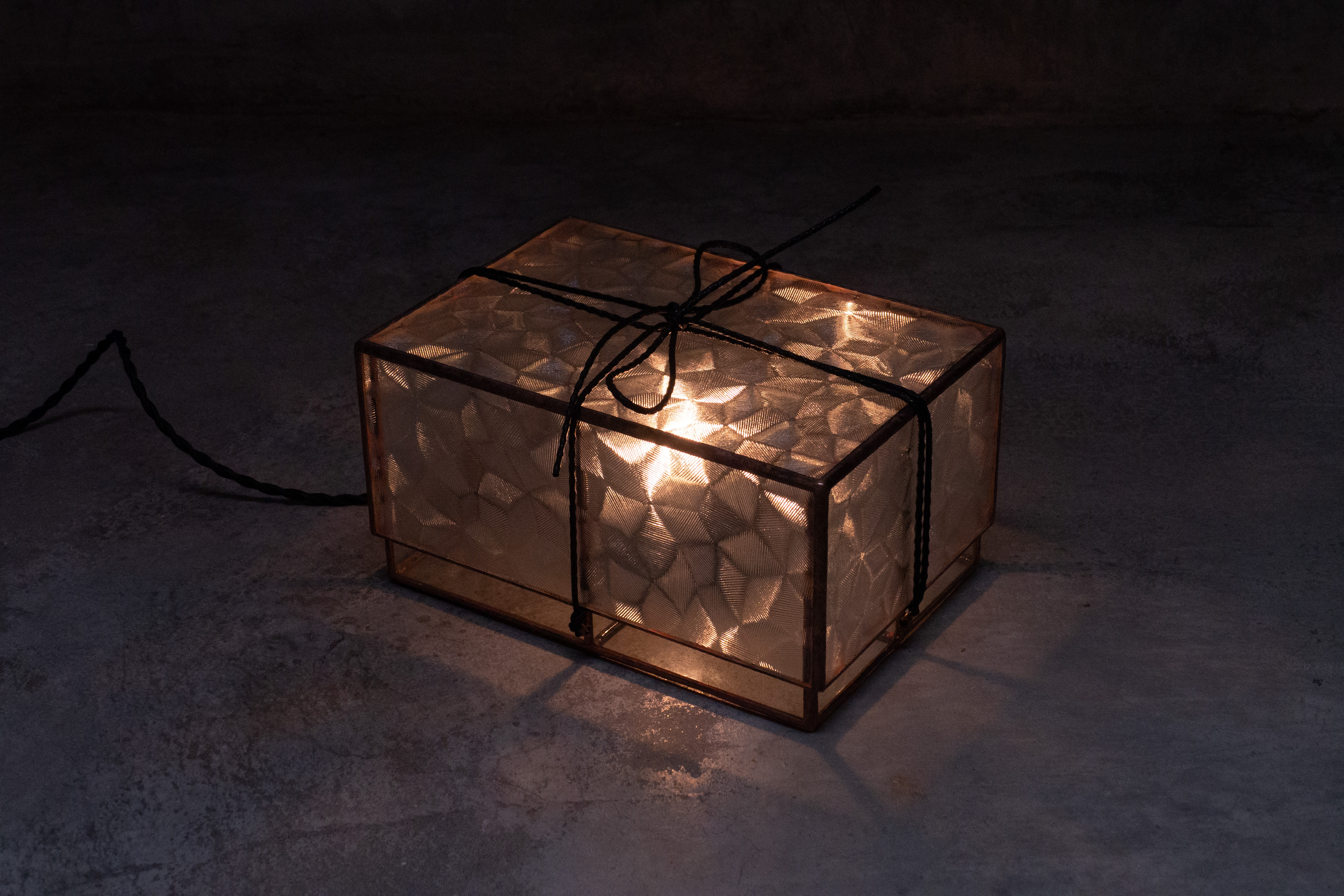 此作品汲取傳統錦囊盒的構思,每次打開或闔上,都需花費一段時間解開繫帶。這短暫的時光,成為我們與記憶共處的契機。當作品在全暗的空間中點亮,你會驚覺,整個空間宛如一個交織過去與現在的時光盒。
