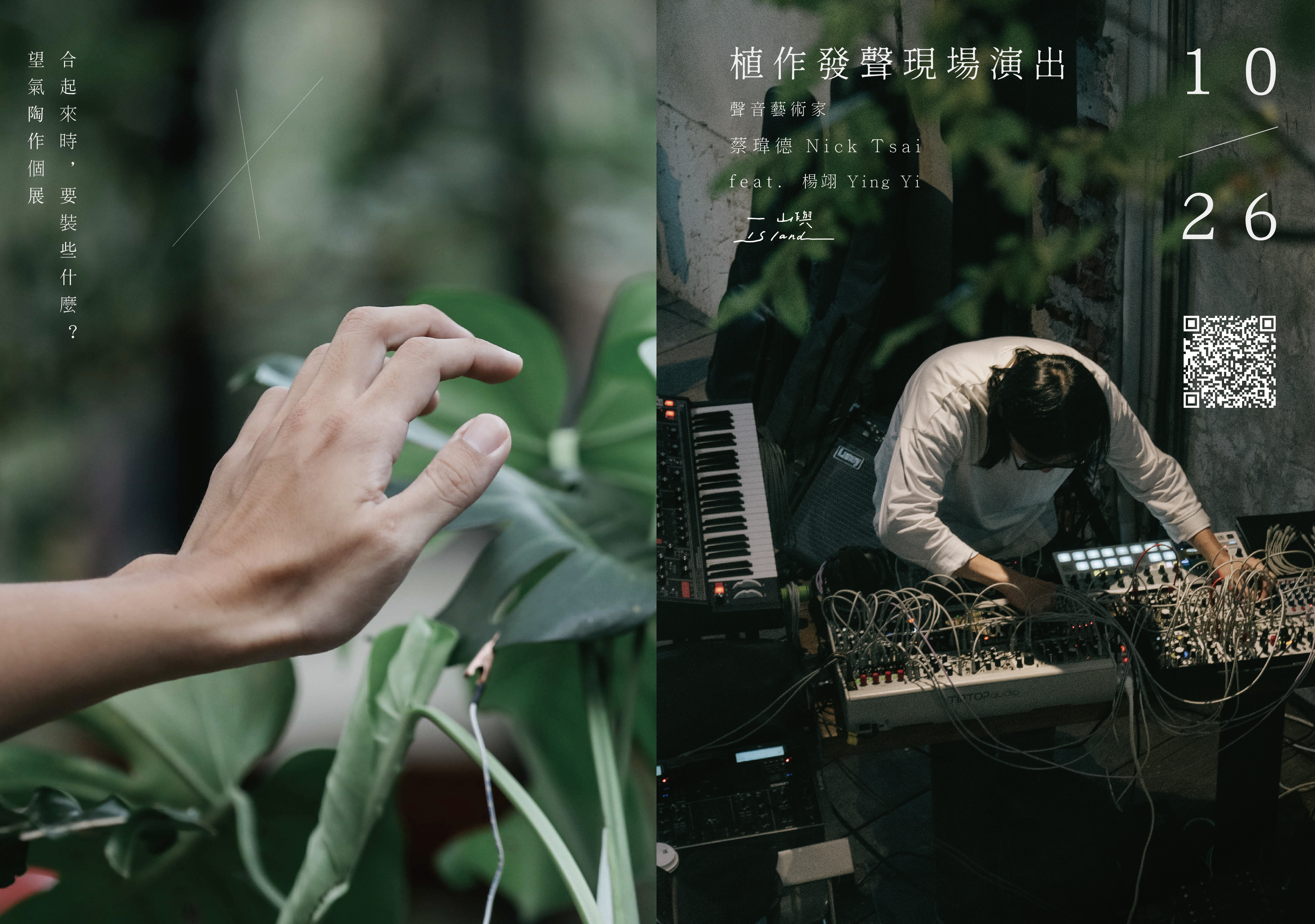 在聽覺的想像,望氣這次邀請到聲響藝術家 蔡瑋德 Nick tsai 與 花藝家 楊翊 Yang Yi,結合望氣的花器作品,帶來植作發聲音樂表演。呼應展覽名稱「合起來時,要裝些什麼?」文字,從中理出這次聲響創作的兩大核心:第一是「物件之間的白」,第二則是「分離與重組」。