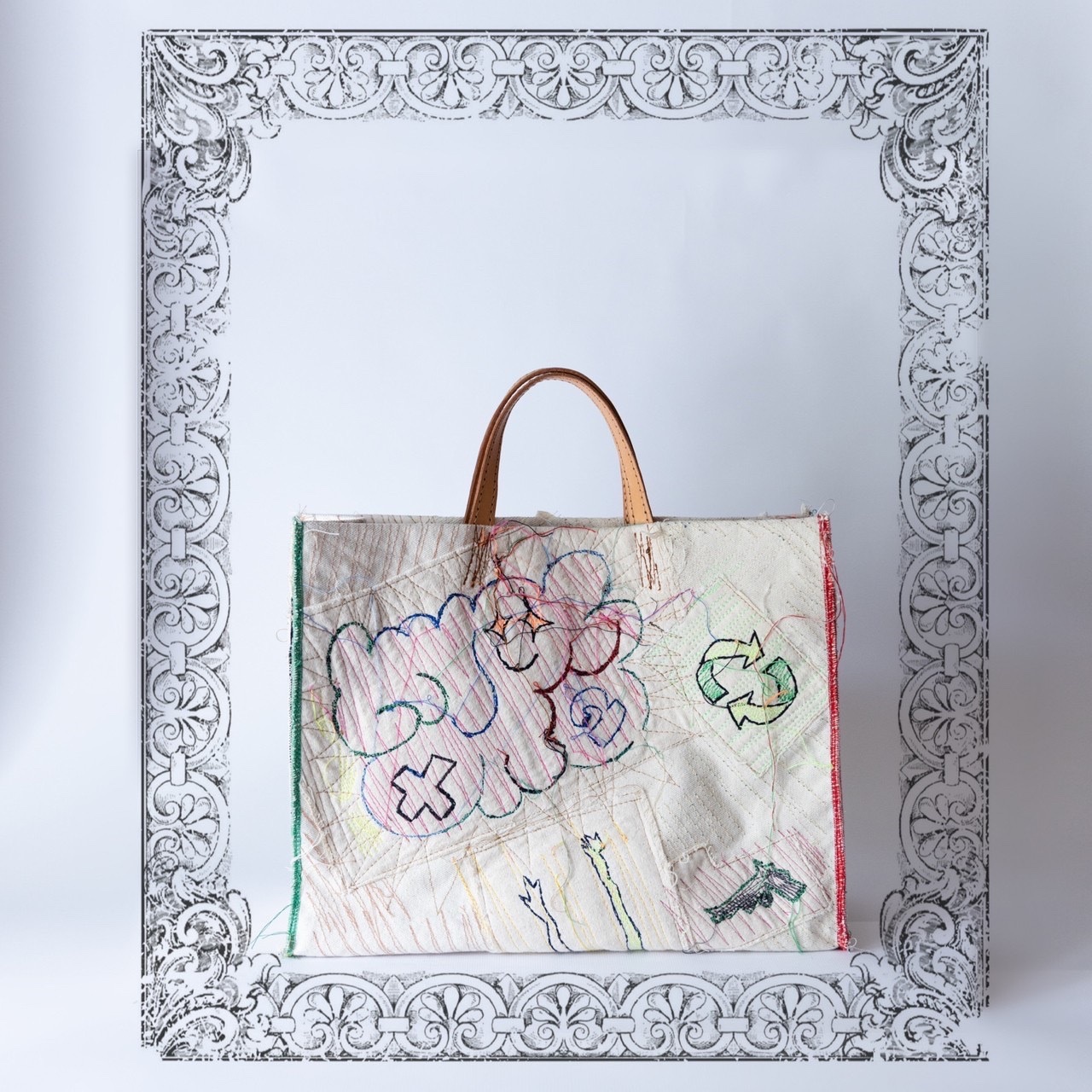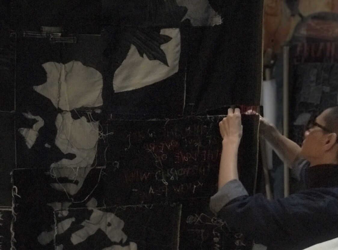 本次展出作品為回收二手牛仔丹寧布料,並重新解構、重組、拼貼,再以素描刺繍塗鴉的方式,表現出 Basquiat 式的街頭爆發力。