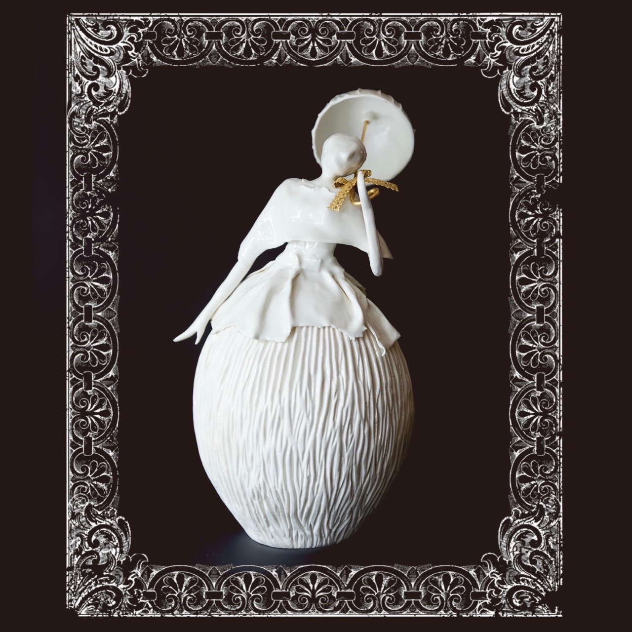 作品多以瓷土以及亮白釉來呈現清透、脆弱以及優雅的法式女性特質,擅長細膩貼花以及釉下彩仕女繪技法,為作品增添浪漫柔美韻味。