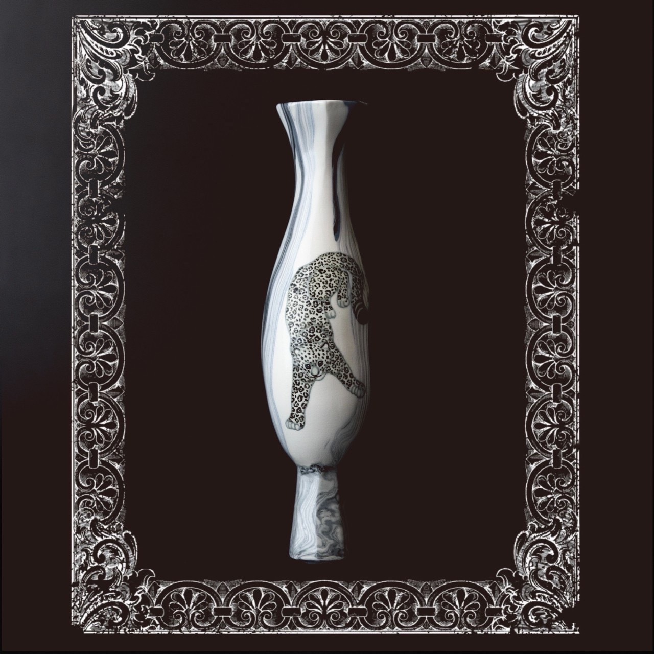 本次展出論述以現代隱士生活為發想,融入雪豹、岩石、蘭、松枝、霧靄雲煙、瀑布等水墨元素,並結合釉下彩與絞胎技法營造出瓷器圖像的層次感,意圖將飄渺輕盈與堅硬強勁對比的極端意象表現出來,因而創作出低飽和、寧靜中帶有時尚感的作品。