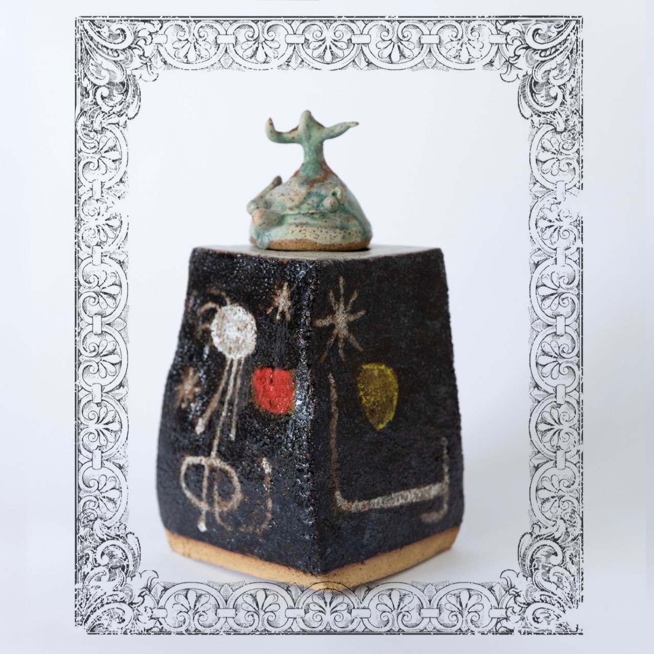 本次展出作品源起於幾次旅行,我最愛西班牙,尤其是米羅的畫風,總有一種天真無邪,貪玩的風格。今年我使用不同技法將陶土塑型,在釉料中添加不同熟料,結合家中收藏癭木等不同媒材及運用,將米羅畫風繪畫融入陶之中,使其風貌更顯得多元。