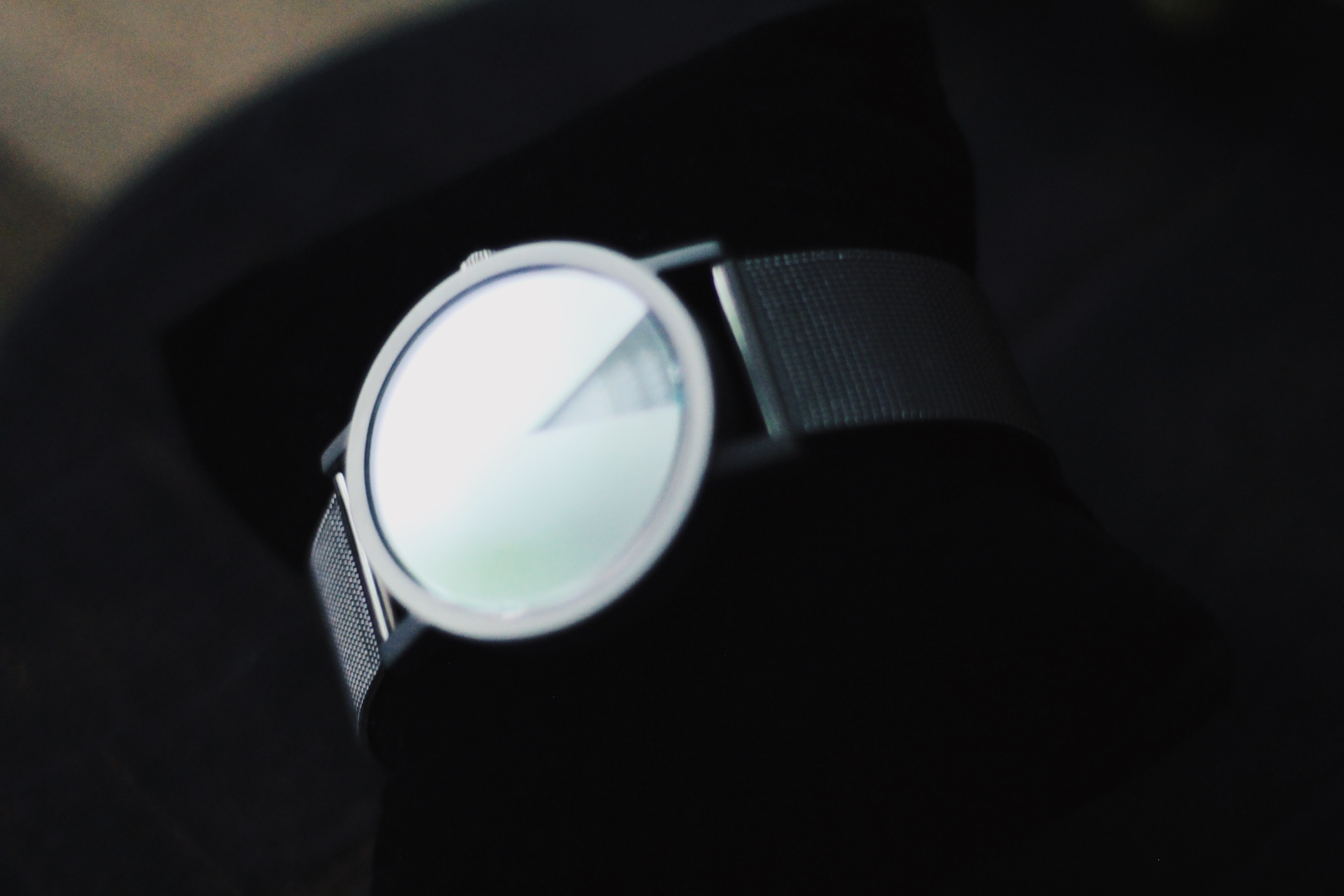 “ 手錶玻璃覆蓋了大部分錶面,顯示錶盤的45度,是希望提醒自己,每天抽取一部份的時間,於生活中探索新的體驗和經歷。 ”