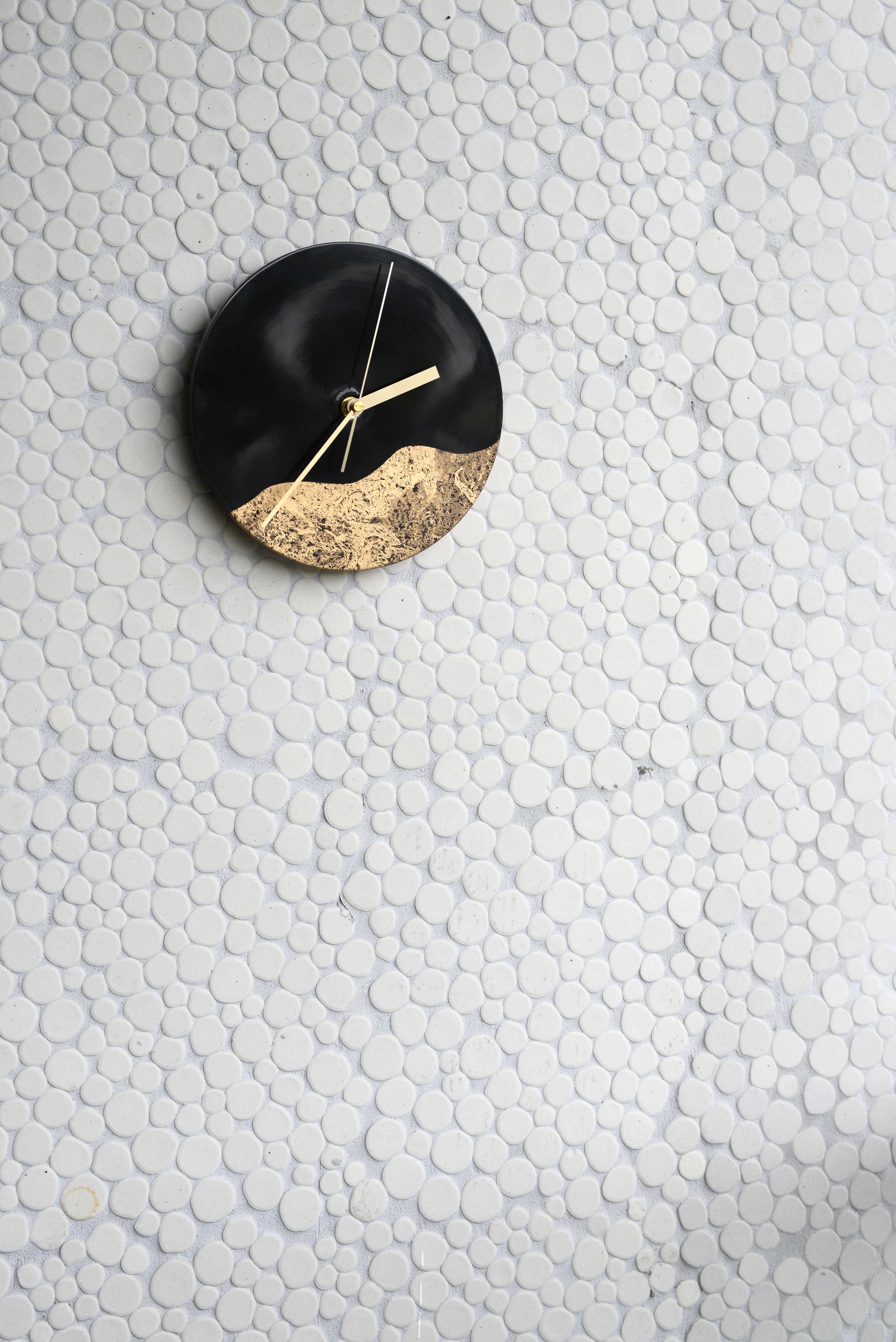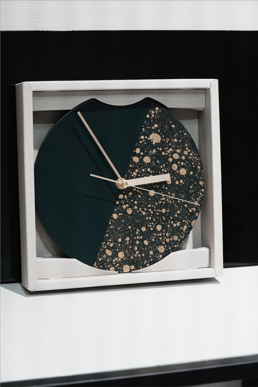 光山行以傳統漆器製作工法為靈感,發想出原創「水蒔繪」技法。利用水跟漆不同比重的特性,創作出流動圖騰,再運用漆的黏性附著在平整光滑的鐘板後,撒上金屬粉末裝飾時鐘。水流動產生的自然紋理,其無法複製的獨特性,展現低調奢華風格與細緻質感,為家中增添優美的工藝氣息。猶如傳統水墨畫的留白之於漆畫的留黑,底漆的暗色對比代金粉的光澤。