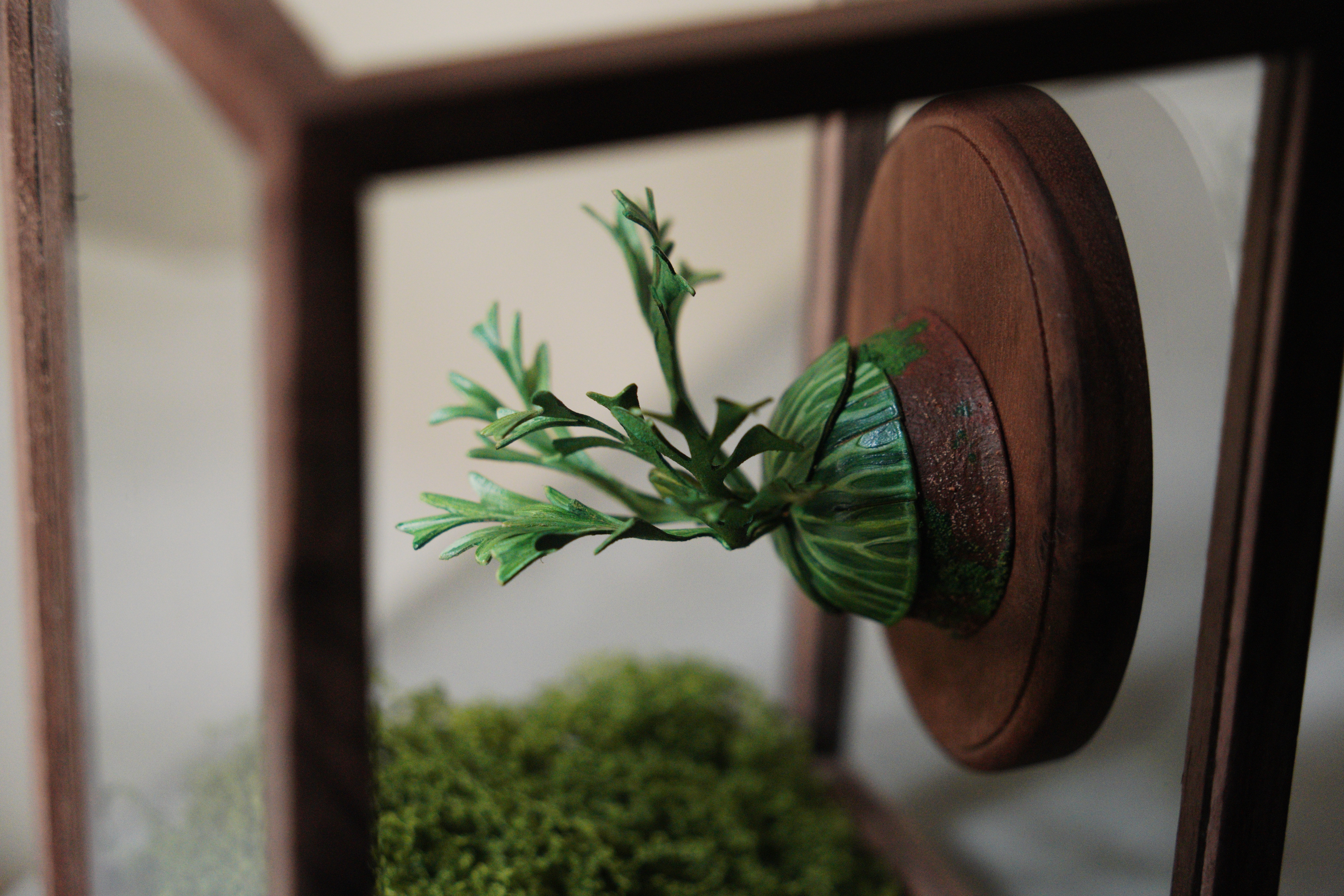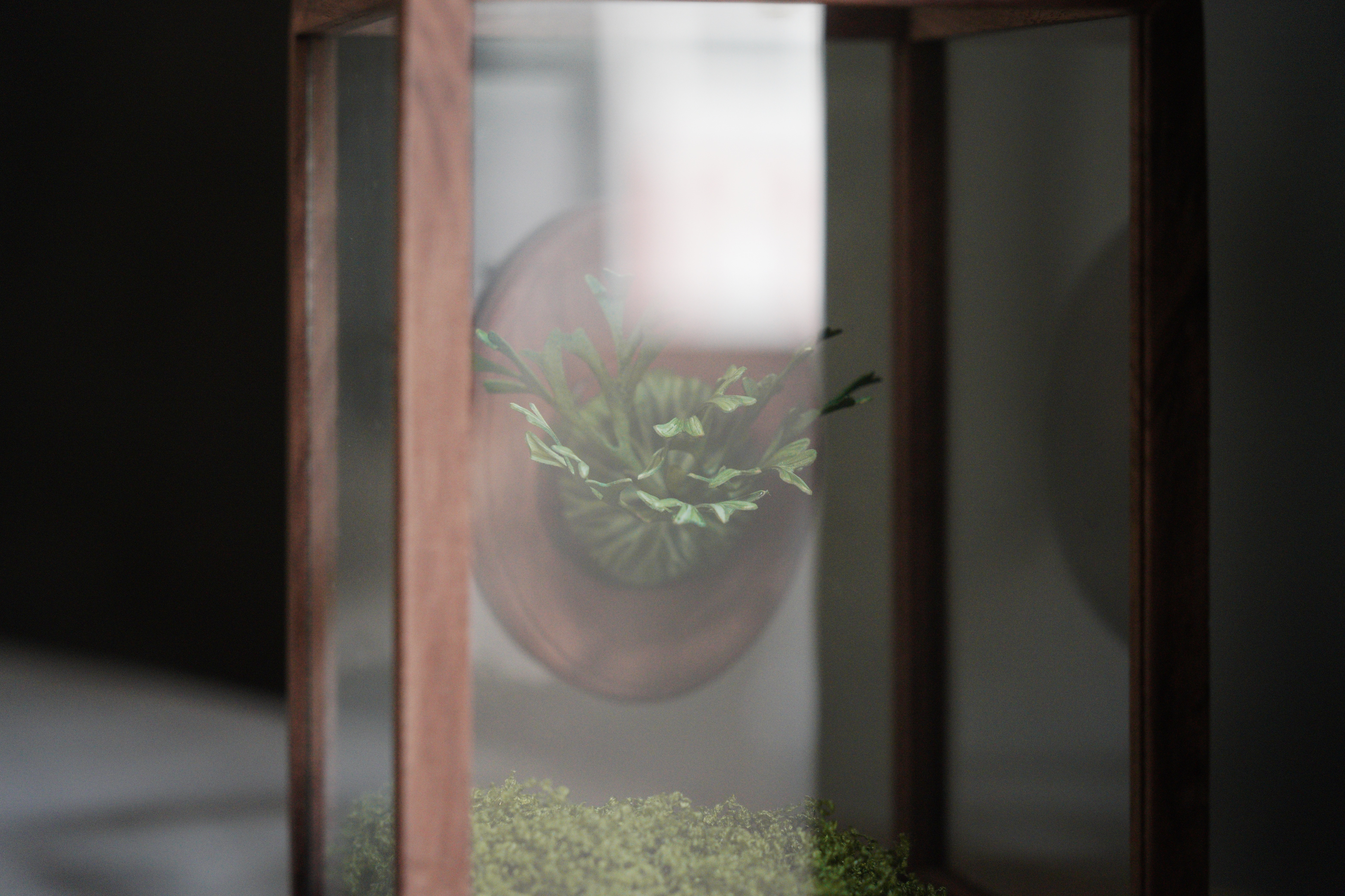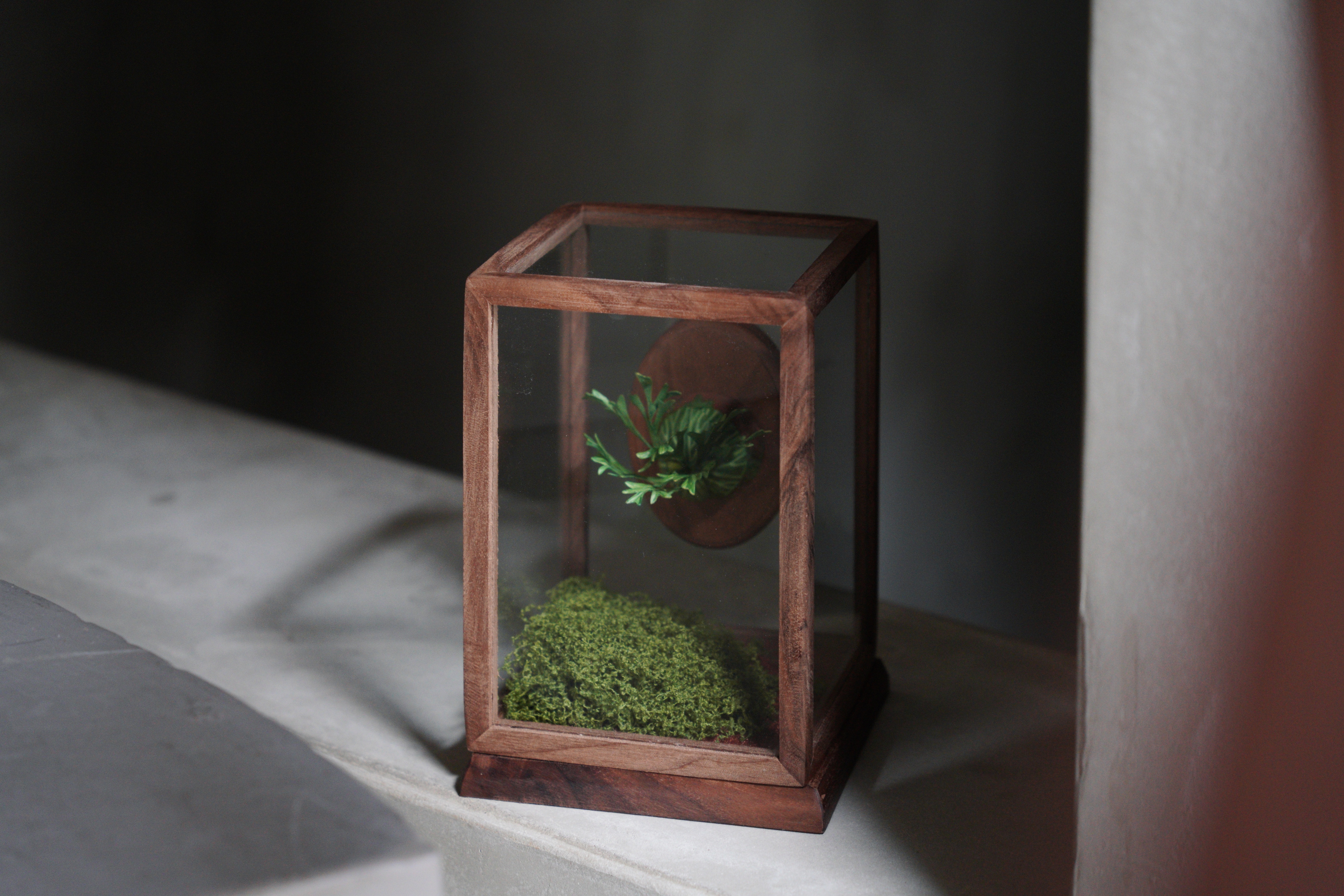 亞猴鹿角蕨,還有像湯匙的孢子葉,這次搭配五面玻璃的展示和,透光性更加,底下的青苔也可以打開來做調整。