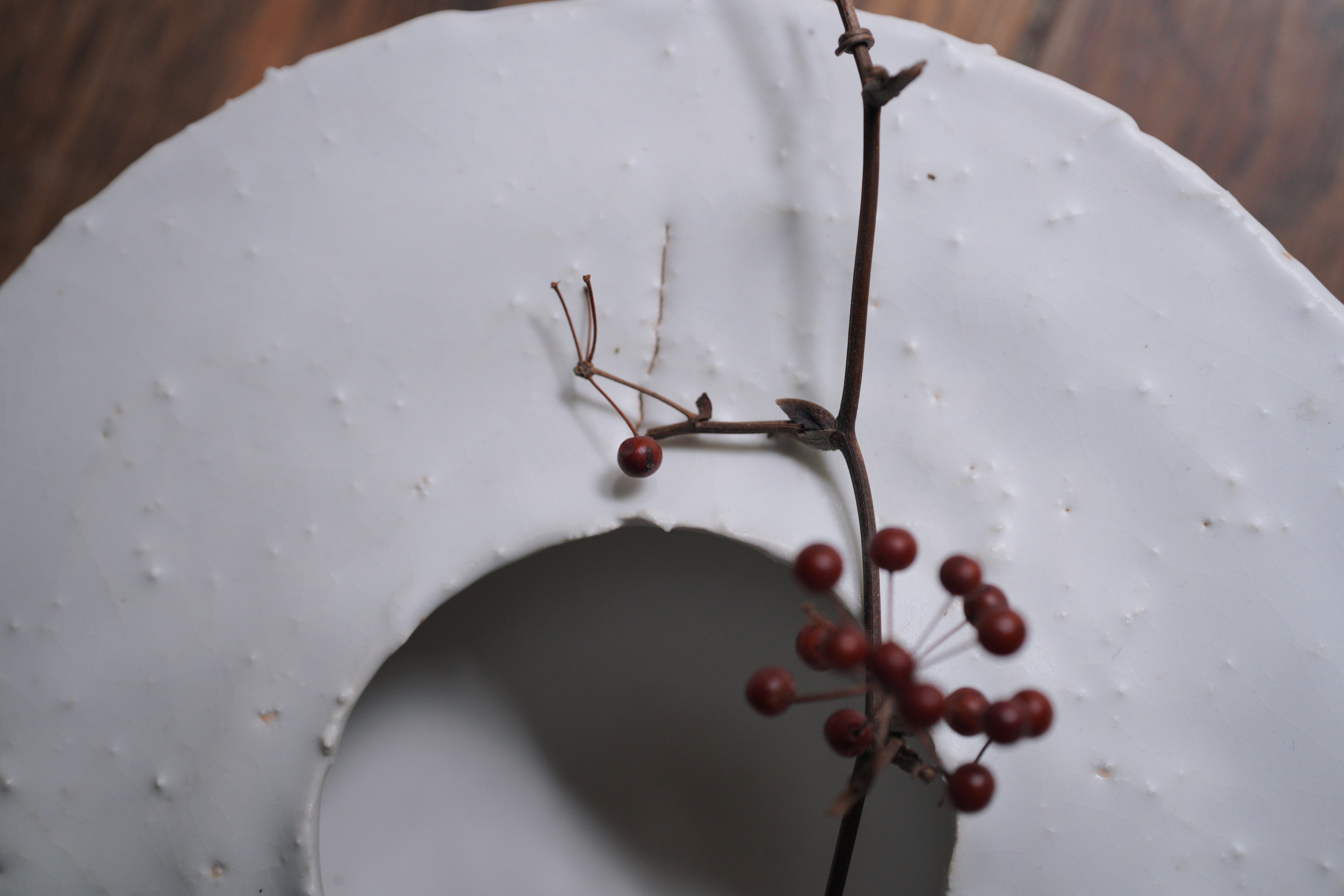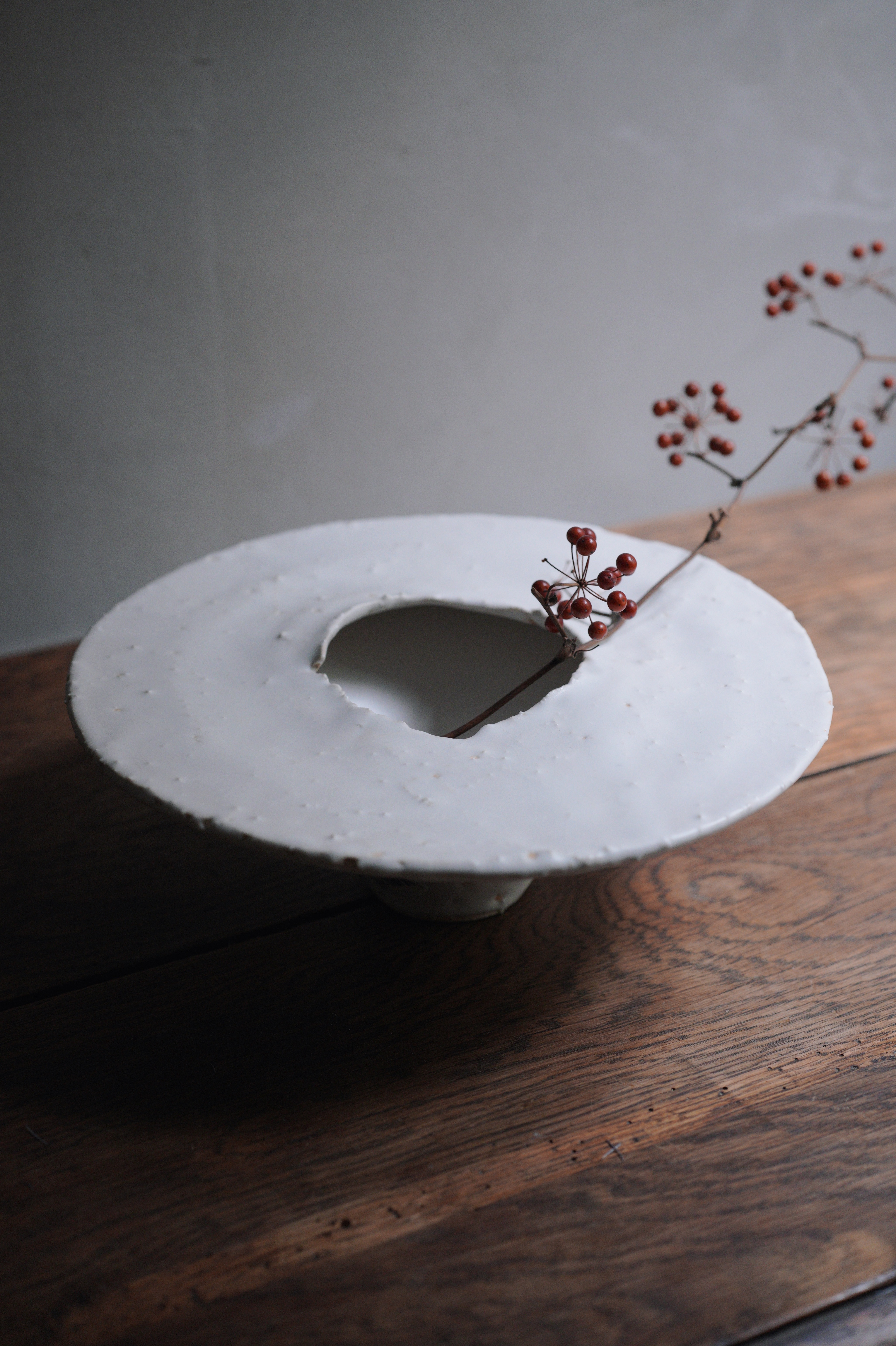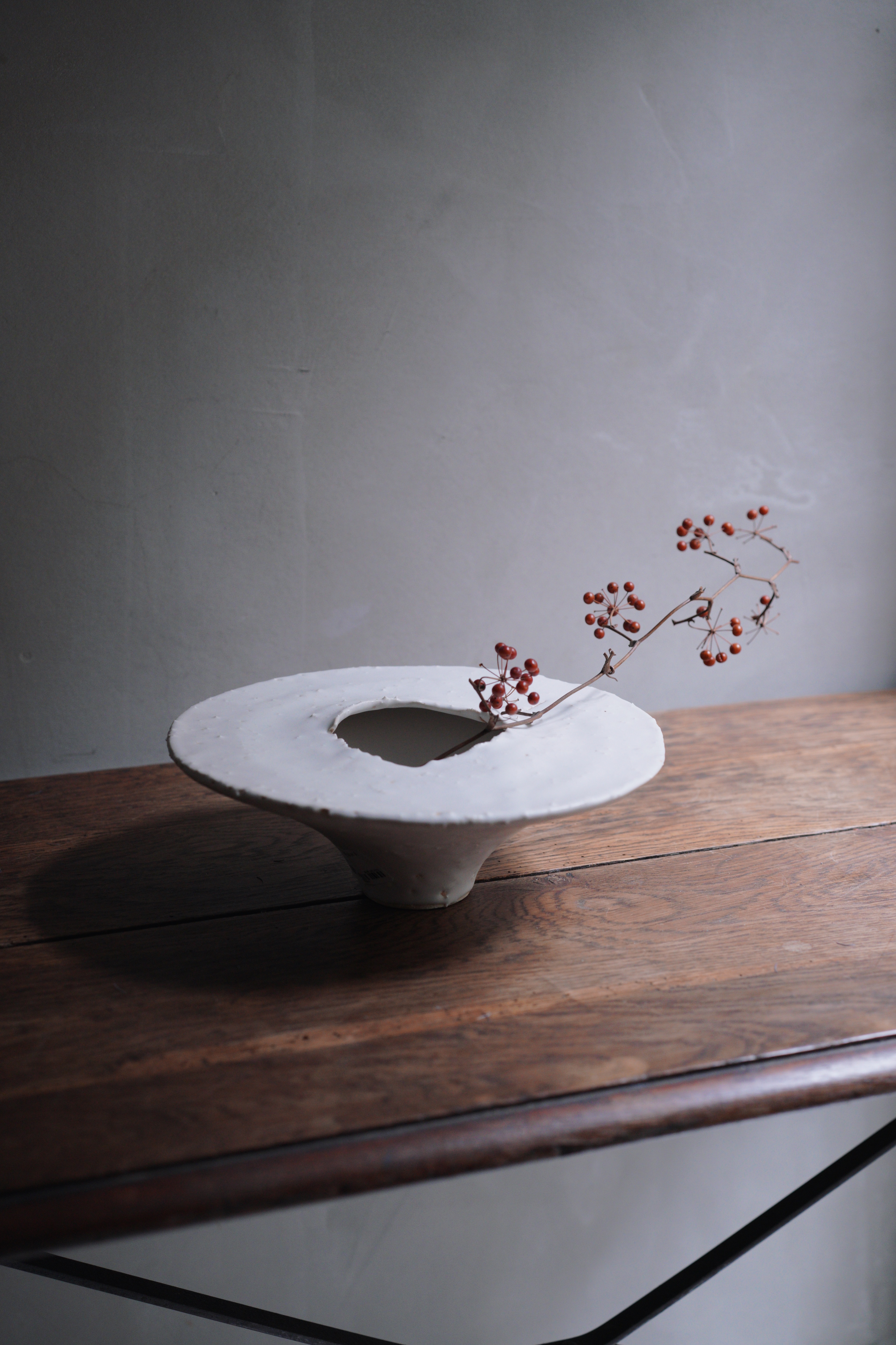 以大型拉胚技法製作,飽滿如月的器型,偌大的口緣與收小的圈足,將兩者比例拉出差異,飽滿的器型又不顯笨重。以半瓷土製作,使用灰青色釉料,在層次多變的釉料當中可見豐富的顏色變化,灰、青綠、米色、橘紅。可作為花器或居家擺件。1230度高溫燒製而成,釉面皆為無毒釉料,可安心使用。
