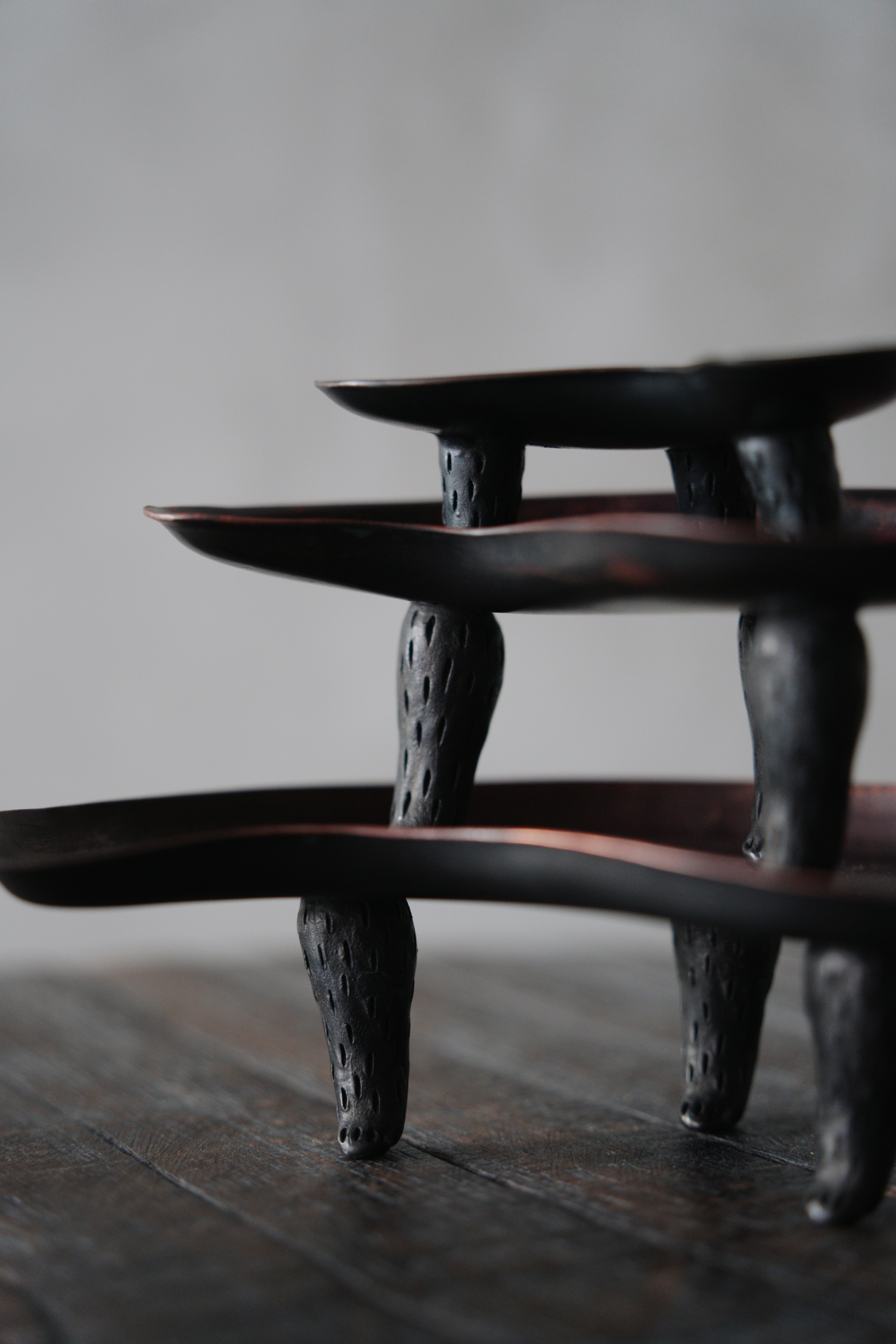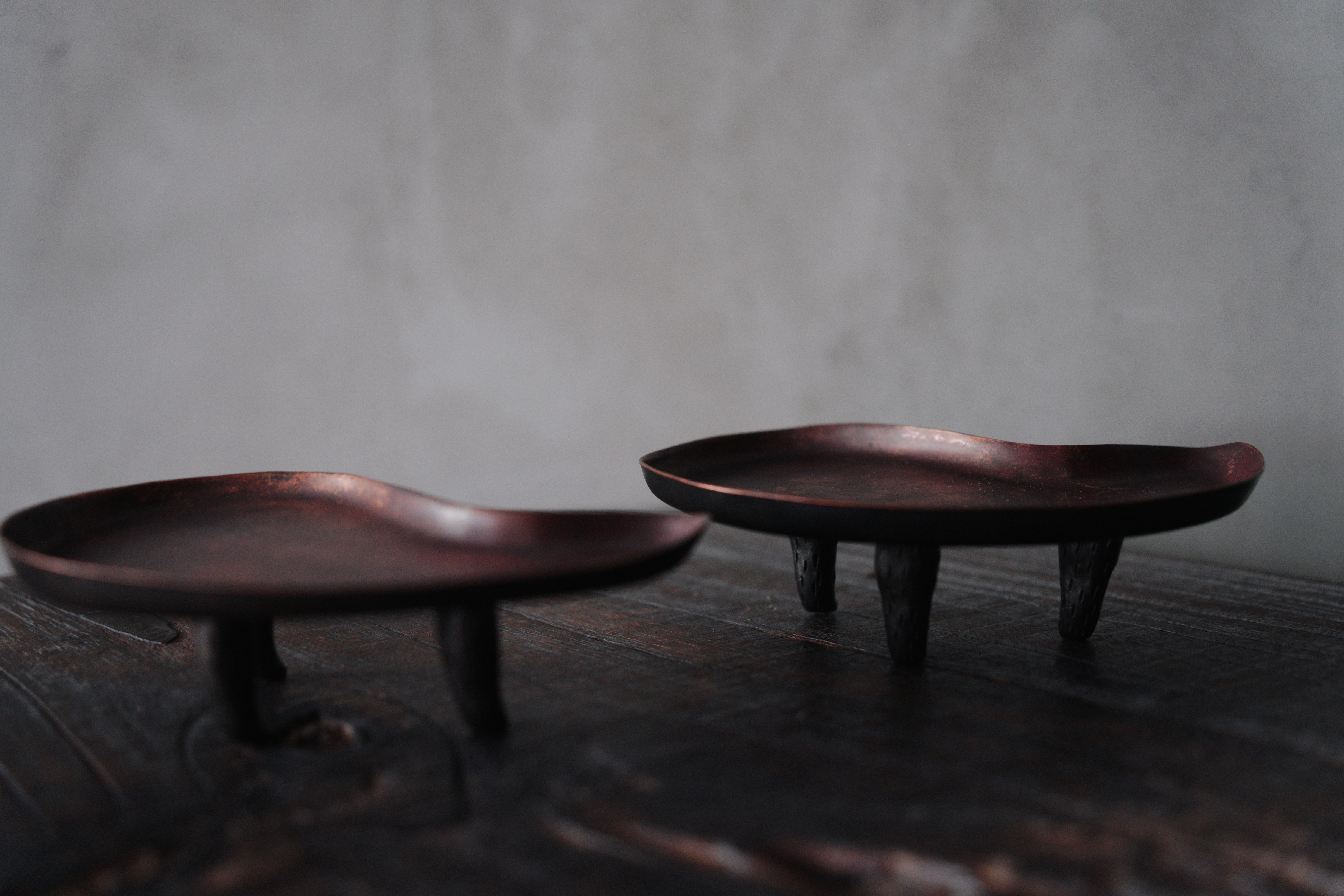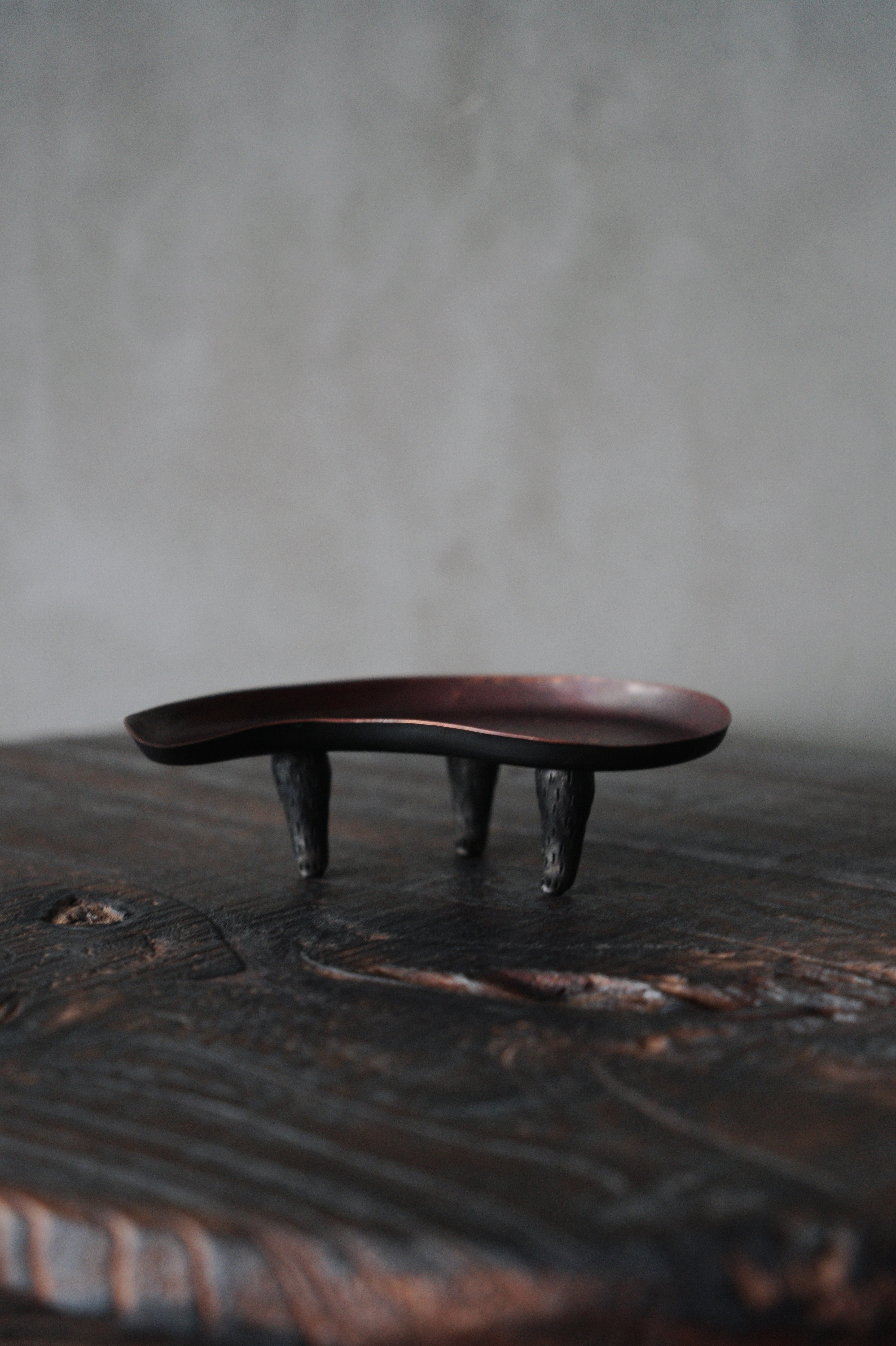 可收納小物件,表面紋路為紅銅受熱後自然產生,貓腳為黃銅染黑。