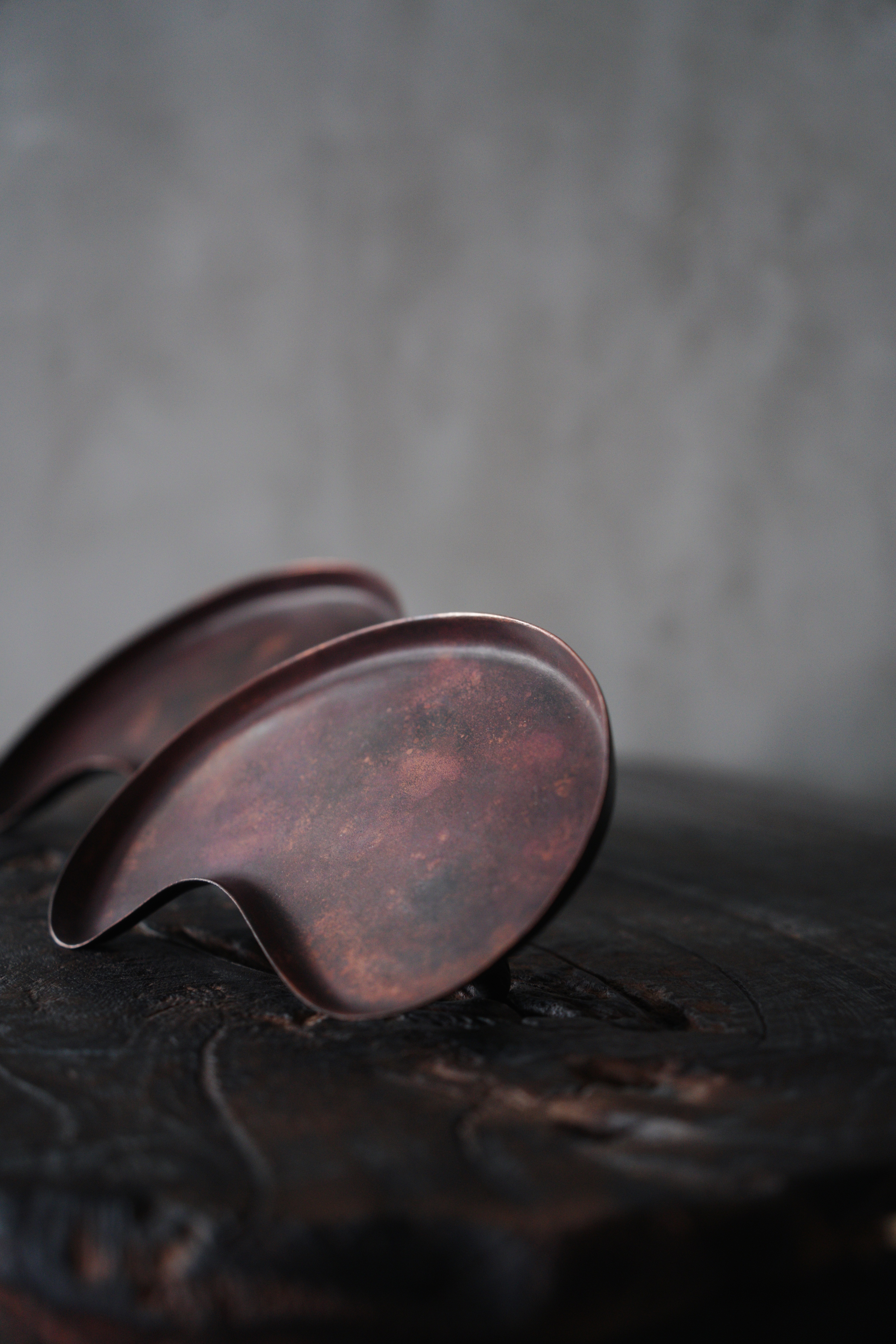深沈的光澤與質感,是黃銅的特性,接觸空氣久了,氧化和使用時的磨損,都會讓原本發亮的表面變黑或出現銅鏽 ,那是時間淬鍊後的改變,平時也可以用銅油以及銅膏擦拭保養。
