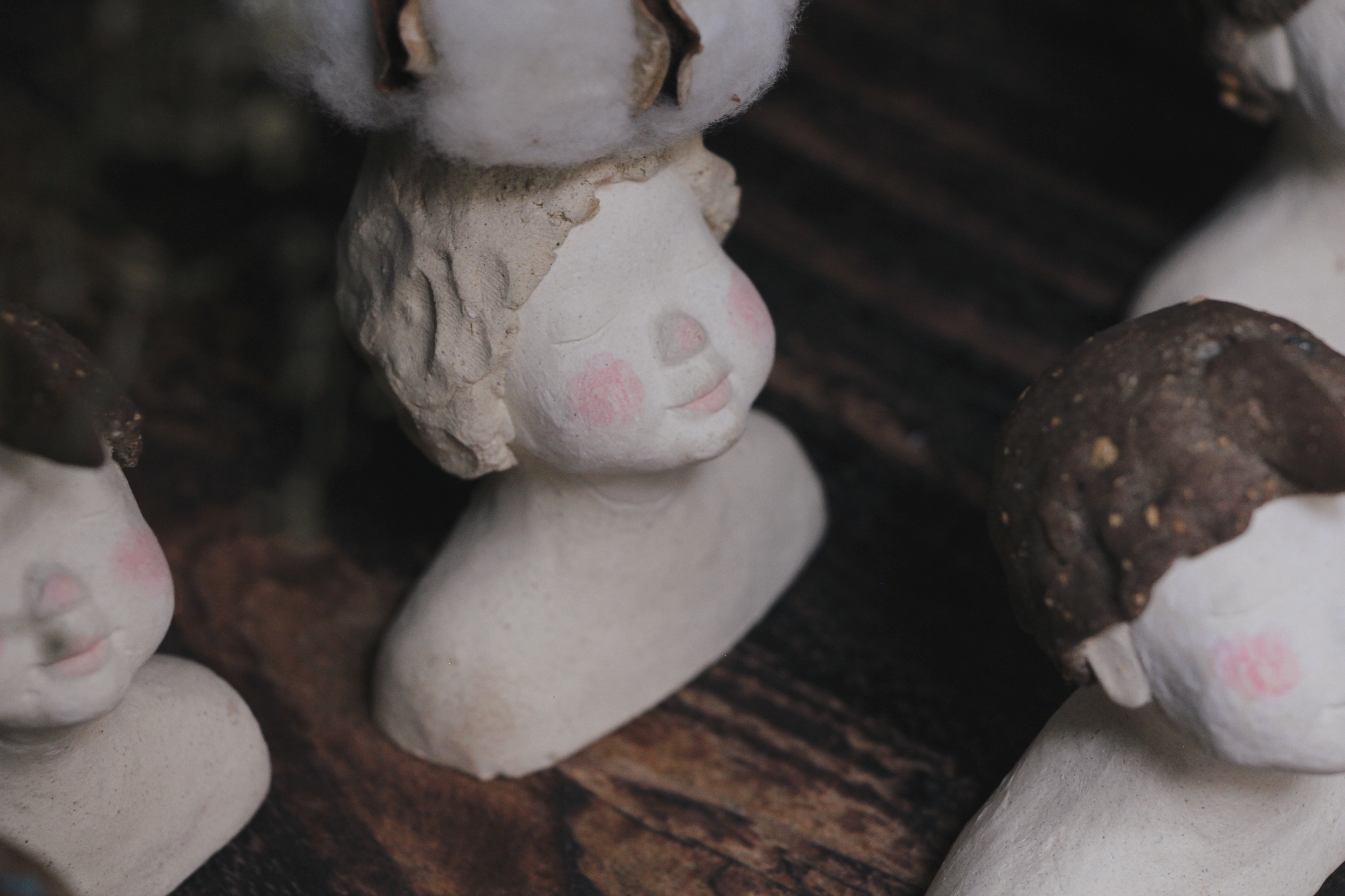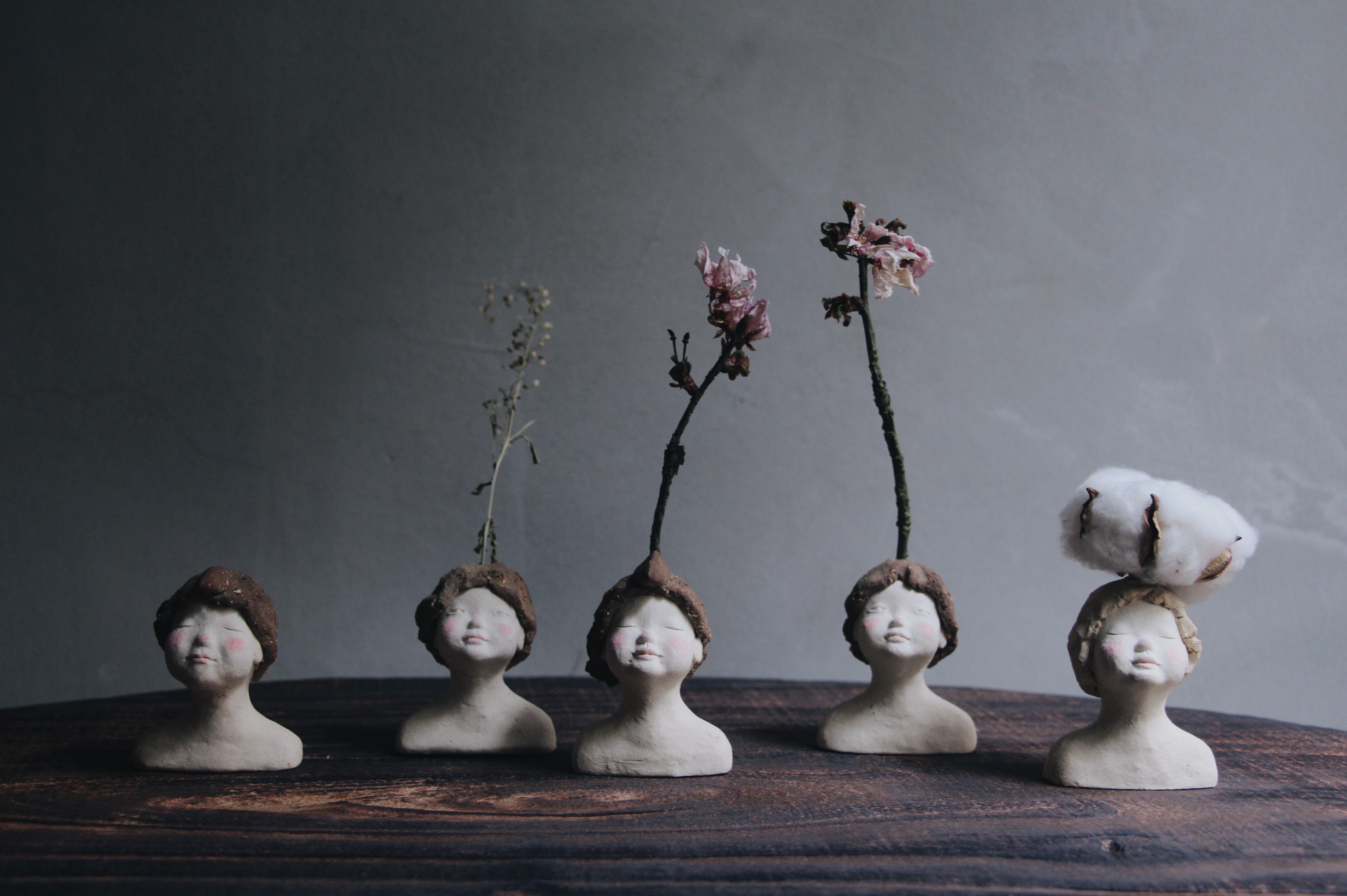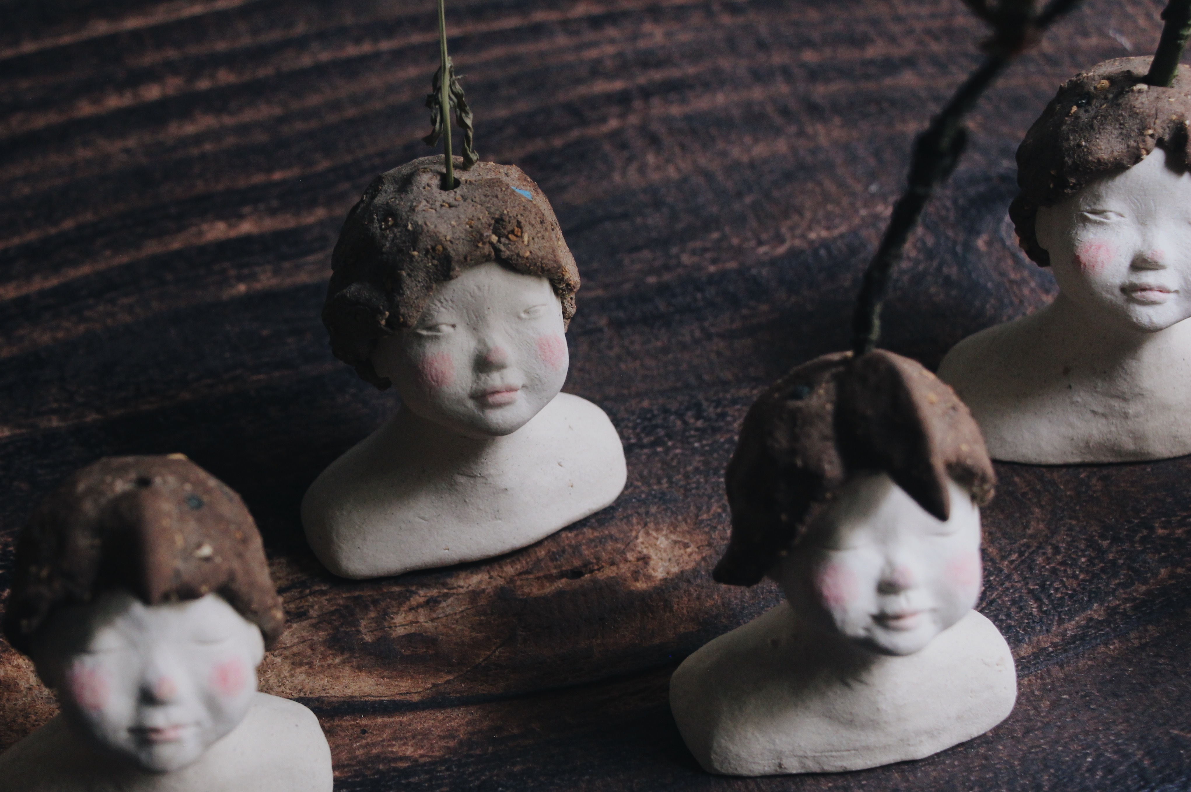 「希望陶人偶能呈現出安靜在聆聽的模樣,而身旁是他的小夥伴,可當乾燥花器。」